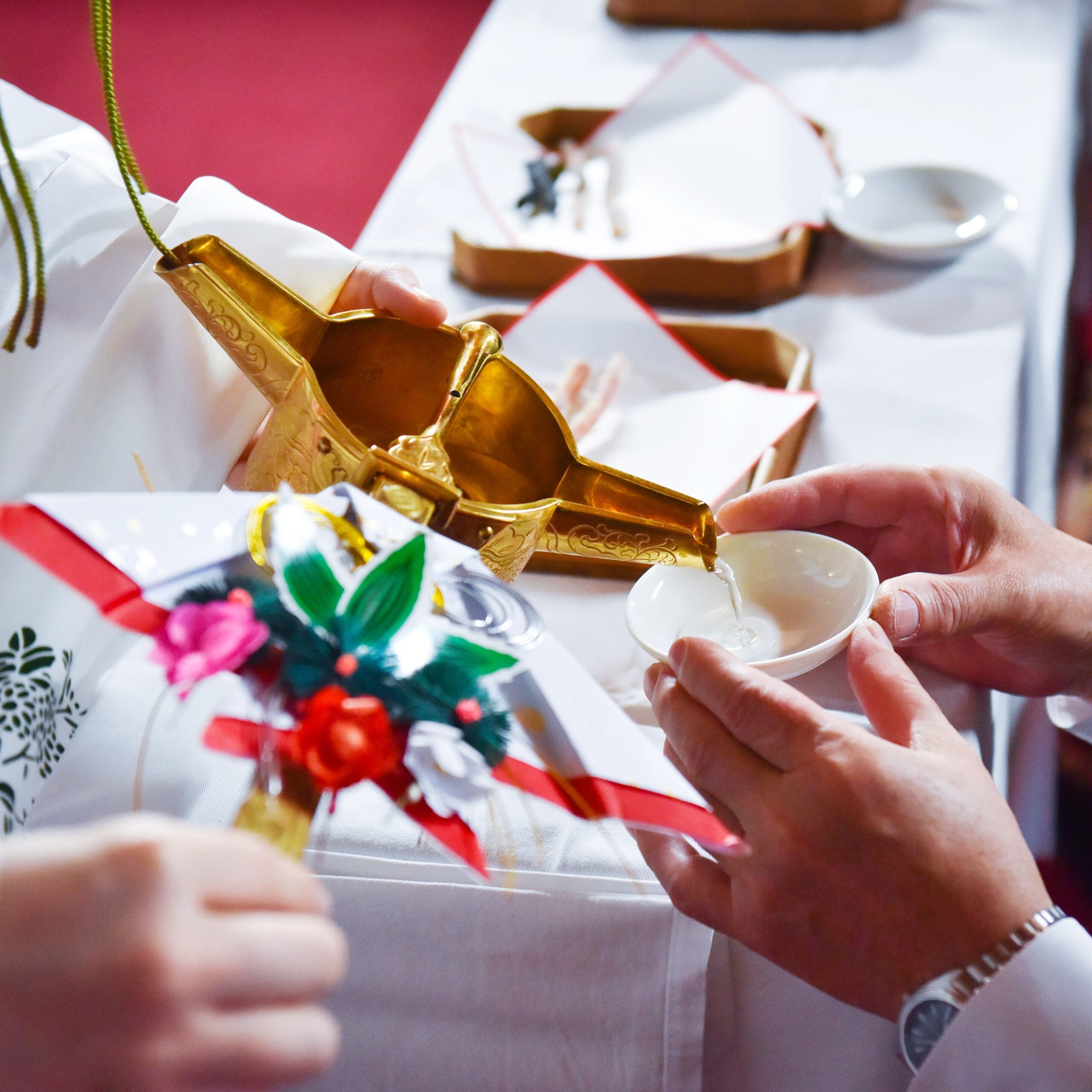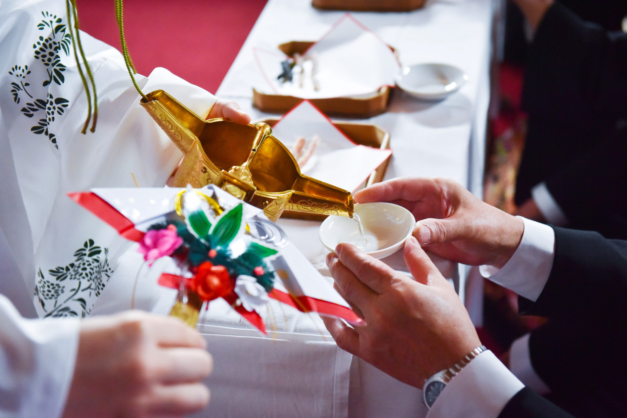 神社の神様に結婚を誓う神前式。日本の伝統的な結婚式の儀式です。